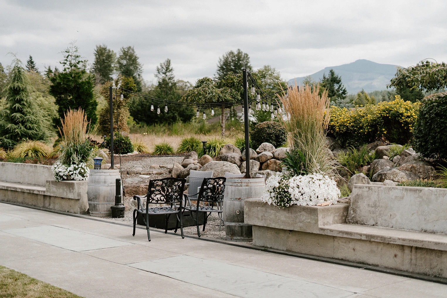 Enumclaw Estates is a countryside wedding venue with lodging, set against stunning views of Mount Rainier and the Olympic Mountains. The property offers both indoor and outdoor ceremony sites to suit your preferences. For smaller gatherings, the rustic barn provides a cozy setting with bedrooms, baths, a fully stocked kitchen, dining area, fireplace, and a large deck. Whichever location you choose, enjoy unmatched privacy and breathtaking scenery.