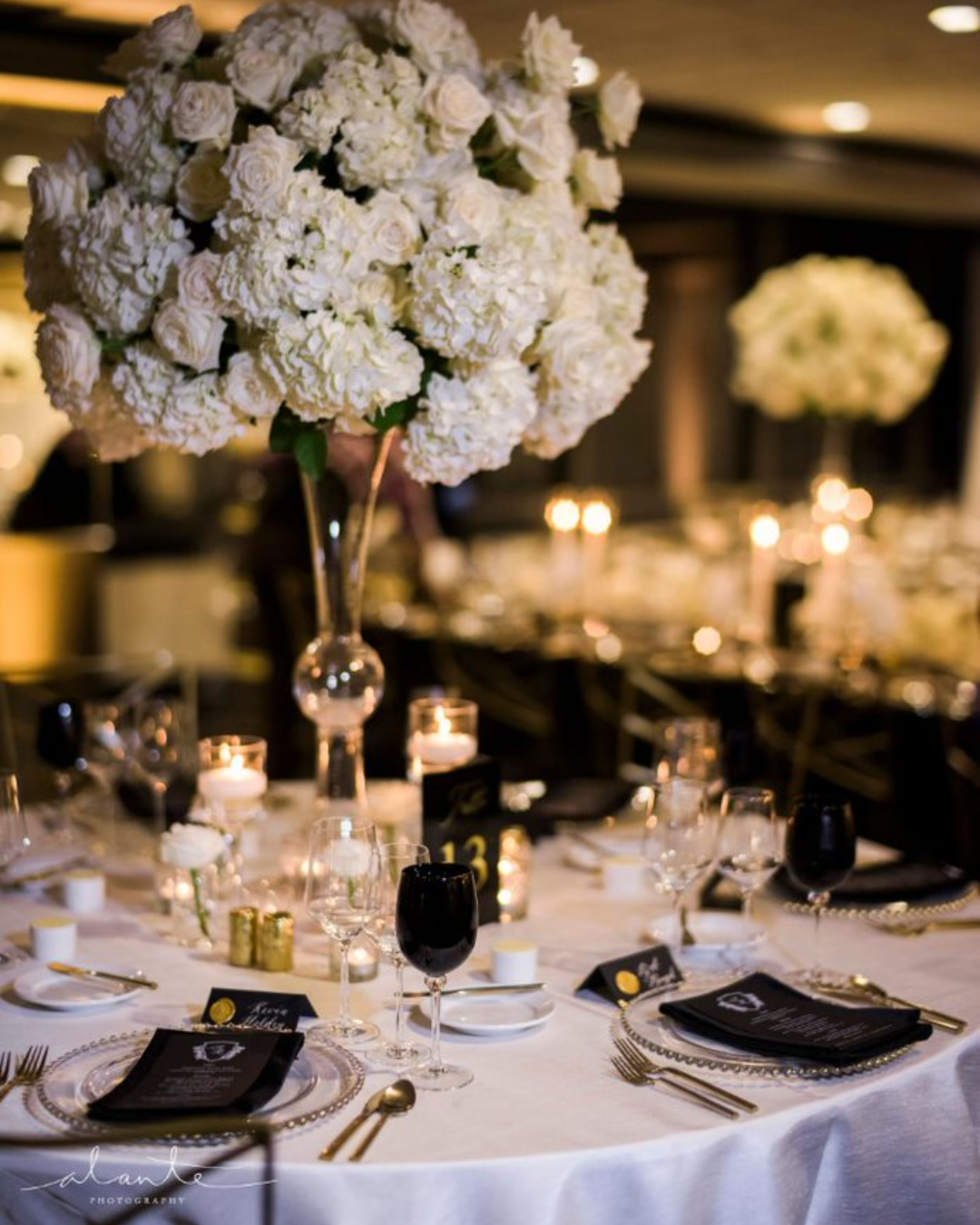 - Tables, chairs, stemware, and linens