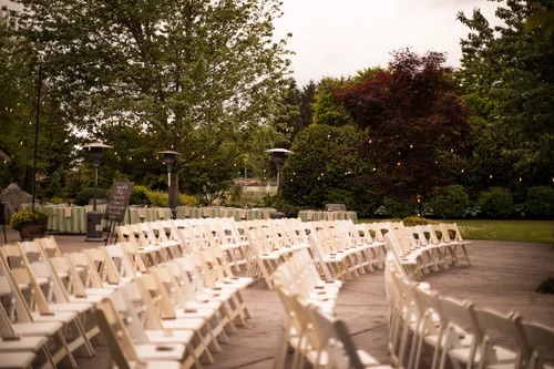 At Pine Creek, manicured gardens frame your wedding day with natural beauty. The large patio, surrounded by lush lawns and vibrant blooms, offers a perfect setting for you and your guests. An airy loft provides a comfortable space to prepare for your big day. The rustic event buildings feature warm wood interiors reminiscent of a craftsman-style winery, creating an inviting atmosphere for your celebration.